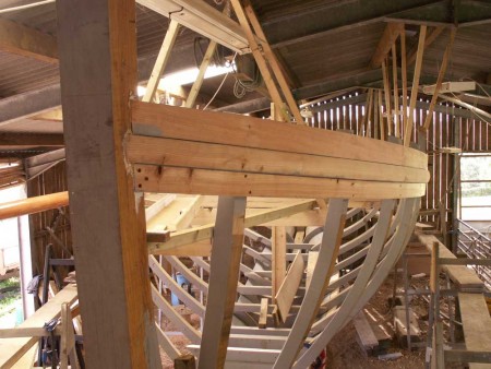 Under the sheer strake (strake being another word for plank) comes the rubbing strake. The bulk of the planking is 1 1/4" thick but the rubbing strake is twice as thick at 2 1/2" and has a rounded profile.