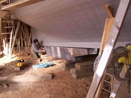 Barnaby has been manoeuvering the lead ballast keel into place under the boat with greasy boards, a winch and a bottle jack. When we were happy that it was in the right place he set to drilling down through the wood floors, the wood keel and the lead ballast keel for the keel bolts. ( See the photo in the ballast keel gallery ). There 'll be nine bolts, the holes are 3/4" diameter and some were almost 4 feet deep so he did well to finish them all in a day. The bottoms of the holes then had to be counterbored to accept the washers and nuts. The holes were then measured and the bolts which have to be specially made have now been ordered.
