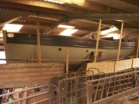 Saffa and Skippy have payed the seams now (filled them with red lead putty), and undercoat has been put on by Meg and Mog. Next week we'll finish the undercoating and start laying on the topcoat as we hurtle through the last few weeks to launch day ! Yes, the crane and the low-loader have been booked. And the big day is Thursday 5th August. On Monday 2nd the roof of the shed will be removed allowing Holly Mae to be lifted straight up.