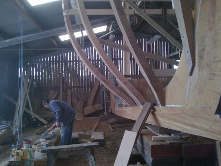 We've started on the sawn frames this week. Despite the interruption of having to go off in search of more oak in the middle of the week we're now getting into the swing of it. The first four of thirteen are up on the keel. Numbers 4, 5 and 6 are doubled to strengthen the structure around the mast and as you can imagine this makes them a bit on the heavy side. A chain hoist had to be used to get them in place.