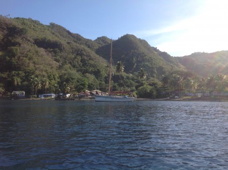 Beautiful though this little bay was, one of our precautions was not to anchor overnight, alone in isolated places, so in the late afternoon we weighed anchor and headed on a couple of miles to a place called Buccament where we spent the night with one other boat. This was another beautiful bay with a luxury resort at one end and a local village at the other, where we anchored and behind these was a lush and verdant valley leading up to some craggy mountains. Pretty spectacular scenery, but normal for St Vincent so we were discovering.